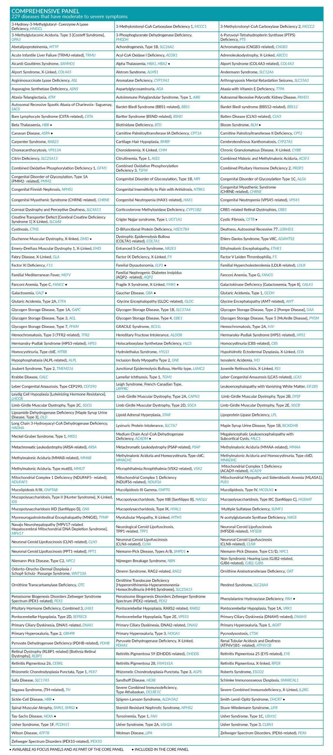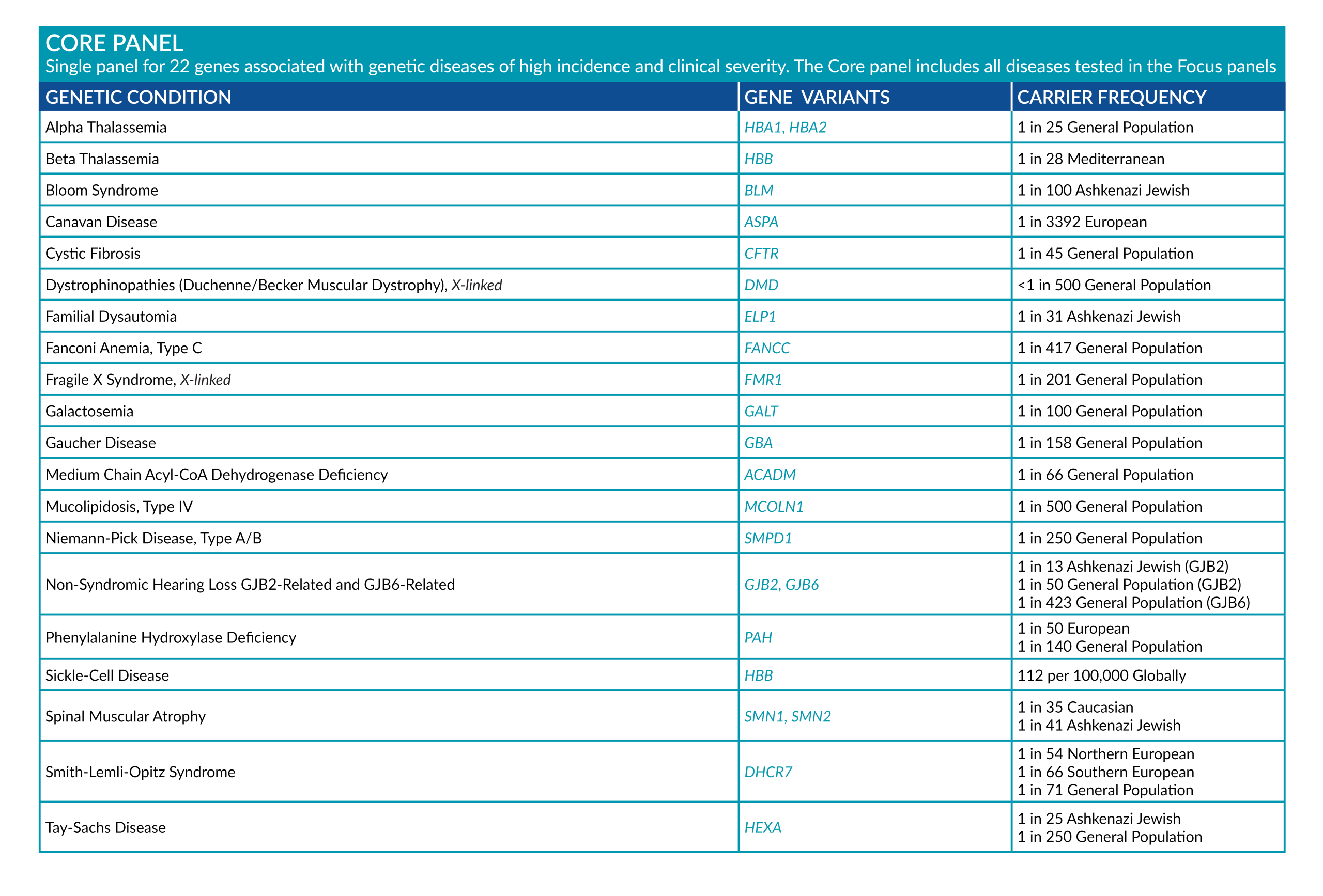 • Core panel: 22 genes covering high-incidence, severe disorders.